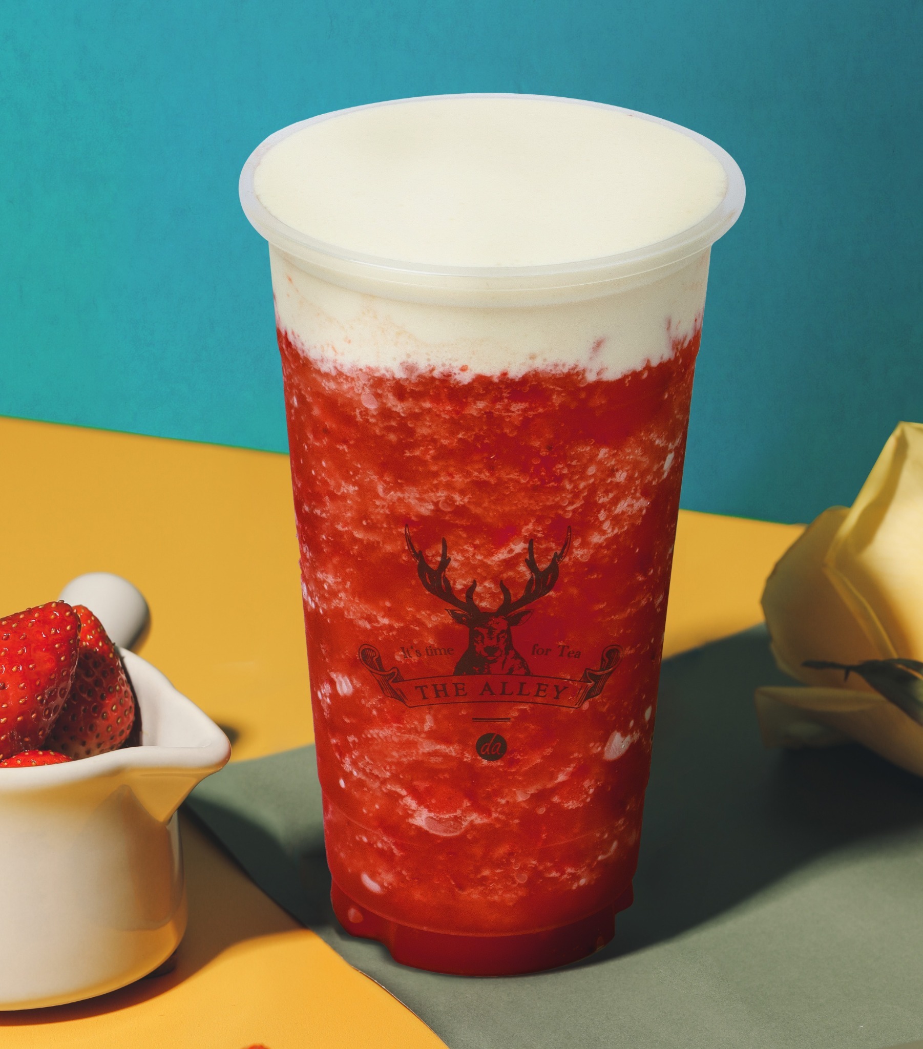 סמות'י תותים אייס-בלנד מרענן על בסיס תה פרימיום אולונג-אפרסק, מעוטר בקציפת שמנת במליחות מעודנת